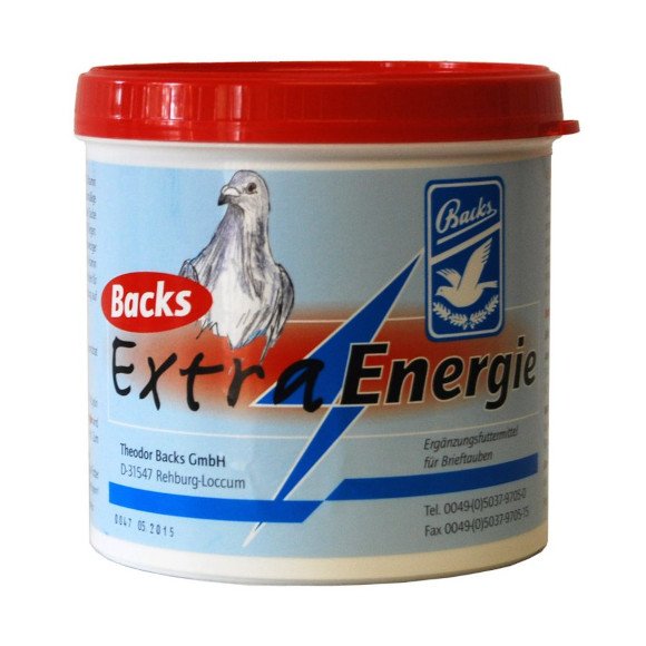 Backs Extra Energie zawiera wysokowartościowe węglowodany, witaminę B12, witaminę C i elektrolity. Starannie dobrane węglowodany gwarantują równomierną przemianę w glikogen. Ze względu na skład produktu możliwe jest dłuższe korzystanie z energii pochodzącej z węglowodanów przez gołębia.